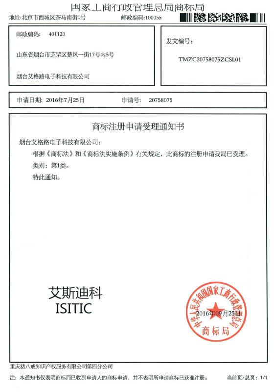 烟台艾格路电子科技有限公司目前拥有四个注册商标,分别是:艾格路®、艾斯迪科®,ISITIC®、tempbond®。艾格路解决方案和艾斯迪科品牌粘合剂期待着与您的沟通。
